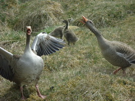 Серые гуси свалили от бабуси. Они шипят, тянут шеи и машут крыльями - не хотят фотаться - и гонят прочь фотографа от своих деток.