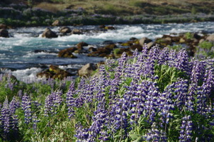 Лазоревая речка с кристальной водой бурлит меж камней и затихает в бирюзовых водах озера. Вдоль берегов, и на склонах холмов раскинулись бескрайние голубые поля цветущих люпинов. Река-водопад