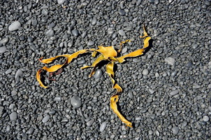 Черный галечный пляж "привет из Пицунды". Полированные камешки как на подбор, - каждый готовый сувенир. А те что у самой кромки воды еще и покрыты лаком. В тихой воде маленькие медузки переливаются неоновыми бочками. Редкие, выброшенные на берег водоросли, высохли до хруста. Рядом крабьи панцири. Куда не глянь - одна экибана.